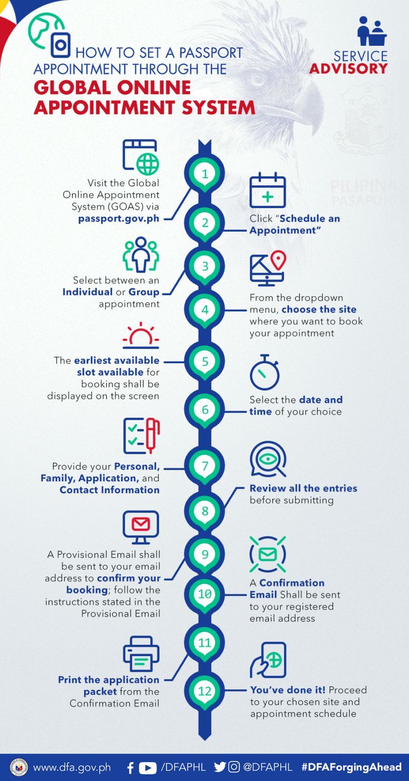Please read and follow all instructions in accomplishing the booking form so that your appointment will not be invalidated. Please expect that most of the slots would be filled up quickly.
